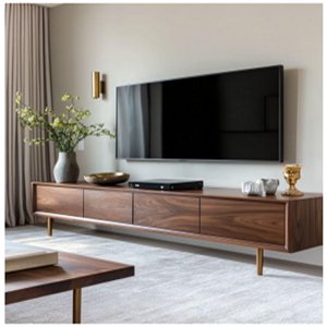 This 72″ TV Console showcases a beautiful mid-century modern design, featuring warm wood tones and iconic sliding slatted shutters. Crafted from high-quality Patex board, the unit is supported by minimalist black metal legs that provide a sleek, contemporary contrast. The textured tambour-style doors allow for easy access to media equipment while maintaining a clean, organized look, making it an ideal centerpiece for any modern home.